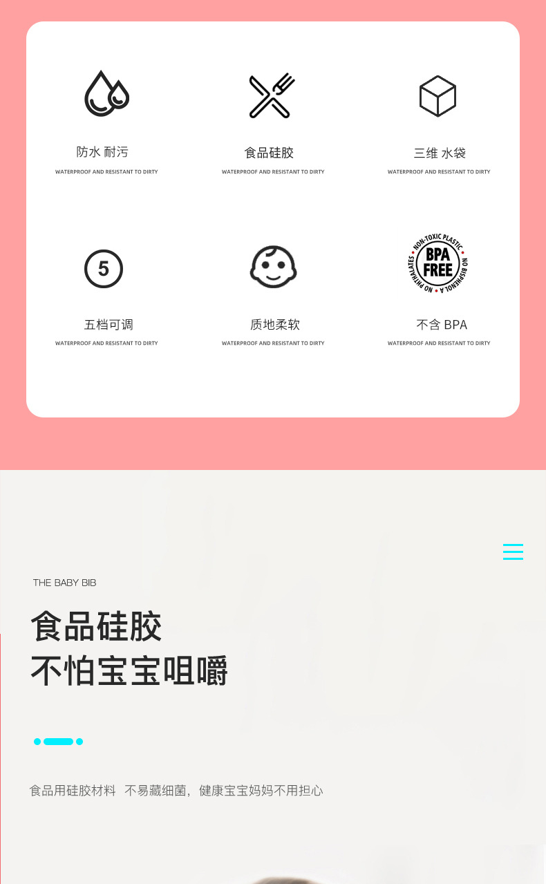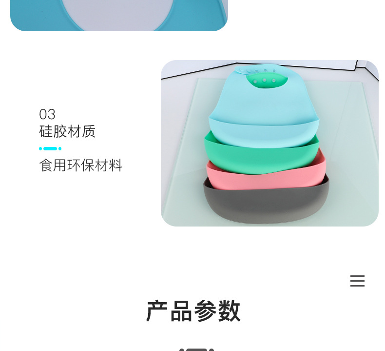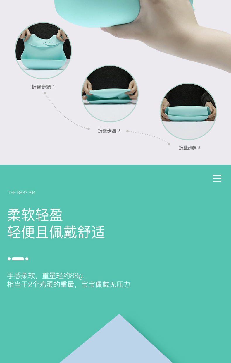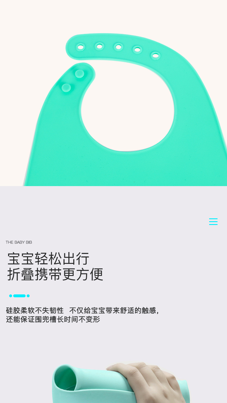 科泰利所生產(chǎn)的硅膠圍嘴兜,選用食品級環(huán)保原材料制作,材質(zhì)可以信賴,它由科泰利硅膠制品廠家經(jīng)過200多度高溫加工成型,耐溫防水防油,清潔方便,水沖即可,可以反復(fù)使用。而且硅膠圍兜現(xiàn)在普遍采用3D立體設(shè)計,凹槽可以輕松兜住食物,這樣的設(shè)計就是在存放的時候比棉質(zhì)占空間。此外硅膠除了作為圍嘴兜也一樣可以做其他嬰童硅膠制品。
